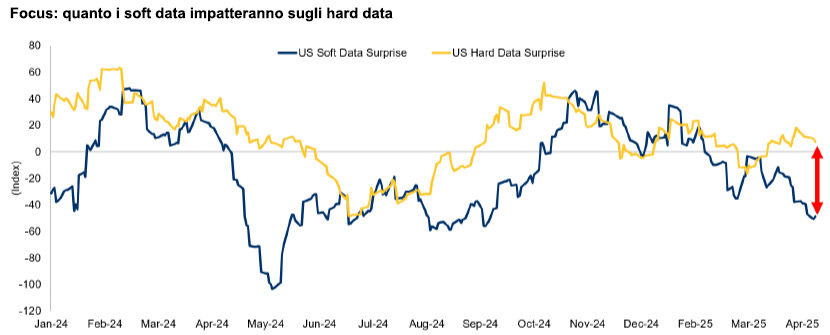 Gli effetti sono già visibili. I soft data hanno iniziato a indebolirsi e, sebbene gli hard data abbiano finora retto, la storia suggerisce che questo tipo di divergenza raramente dura. O le aspettative rimbalzano o l'attività rallenta.